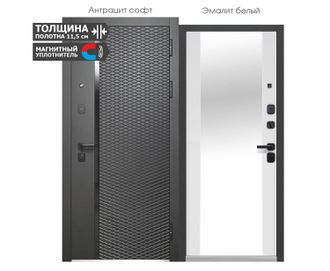 • Внешнее/внутреннее покрытие: фрезерованная МДФ-панель 12 мм, вставка черный лакобель, цвет пленки: Антрацит софт / МДФ-панель 10 мм, цвет пленки: Эмалит белый, встроенное «зеркало в пол» с защитной пленкой от осколков